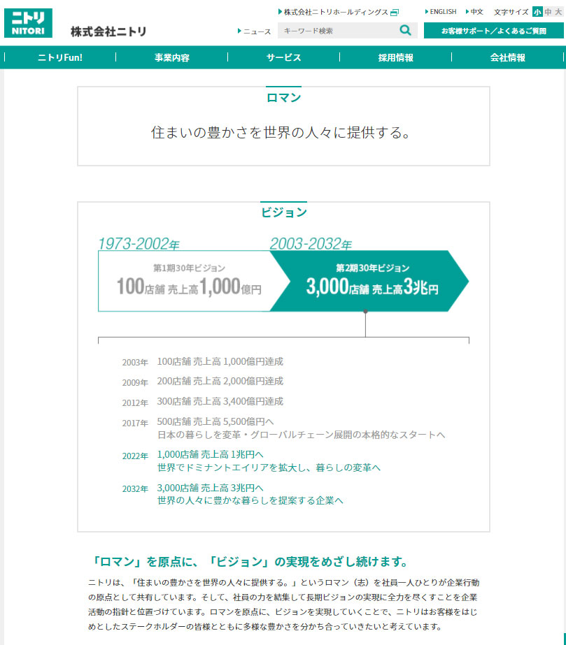 理念が「ロマン」で「住まいの豊かさを世界の人々に提供する」で、ビジョンが店舗数と売上高になっています。2002年までの30年間のビジョンが100店舗、売上1000億円で、2032年までの30年ビジョンは3000店舗、売上3兆円と途方もないですが、現場ではこれが年次でブレークダウンされて事業計画として展開されているのだと思いますが、目的と行動指針にあたる「ロマン」が不変でぶれません。