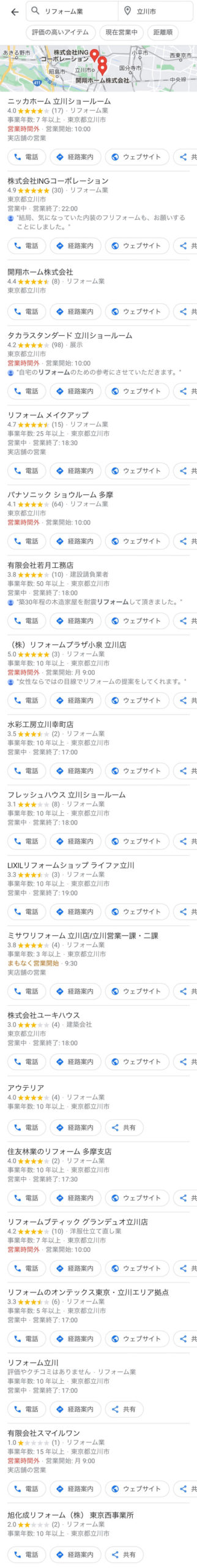 Googleで「リフォーム 立川」と検索したするとGoogleMapの下に3社ほど情報が表示され「もっと見る」で左のような一覧リストがスマホに表れます。特に知っているリフォーム業者がいるわけではない一般の生活者の視点では、実にありがたい業者リストになります。