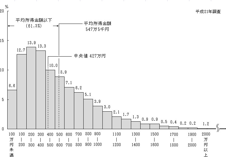 この考え方の分布と一致しているわけではないですが、厚生労働省の世帯所得分布です。
