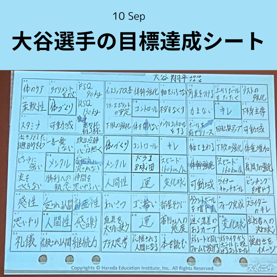 昨日の続きです。大谷翔平選手が高校1年生のときに書いた目標達成シート(マンダラチャート)です。