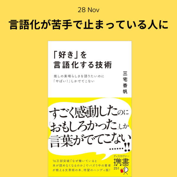 おはようございます。11月28日SHIPの朝礼を始めます。 言語化の重要性については、ずいぶん前から伝えていますが、いまだに苦手な人もいると思います。『「好き」を言語化する技術』では、言語化の難しさを… 続きはこちらから →