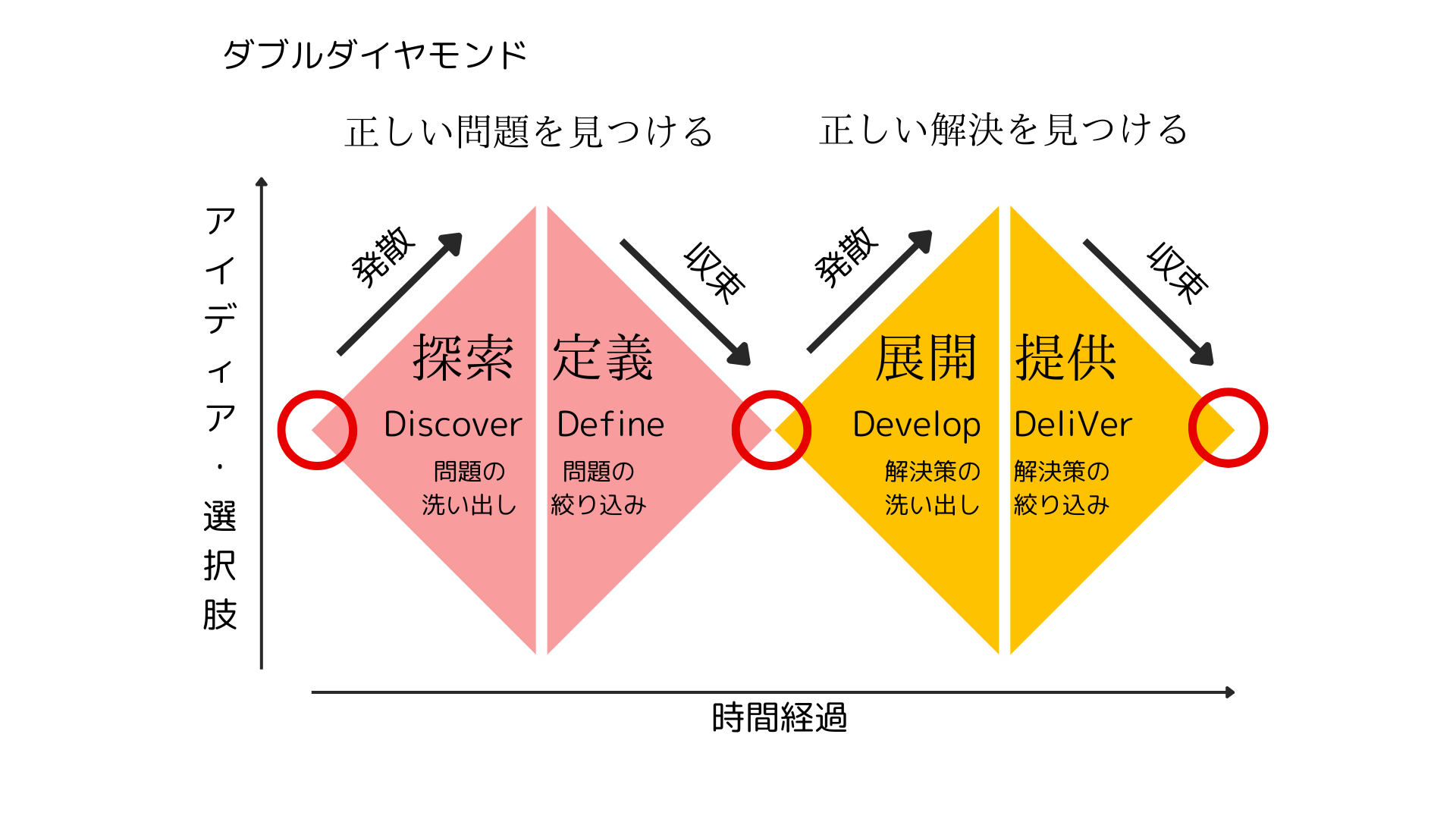 ダブルダイヤモンドについて、正しい問題を見つけるために、問題の洗い出し→問題の絞り込みをする、正しい解決を見つけるために、解決策の洗い出し→解決策の絞り込みをすること。