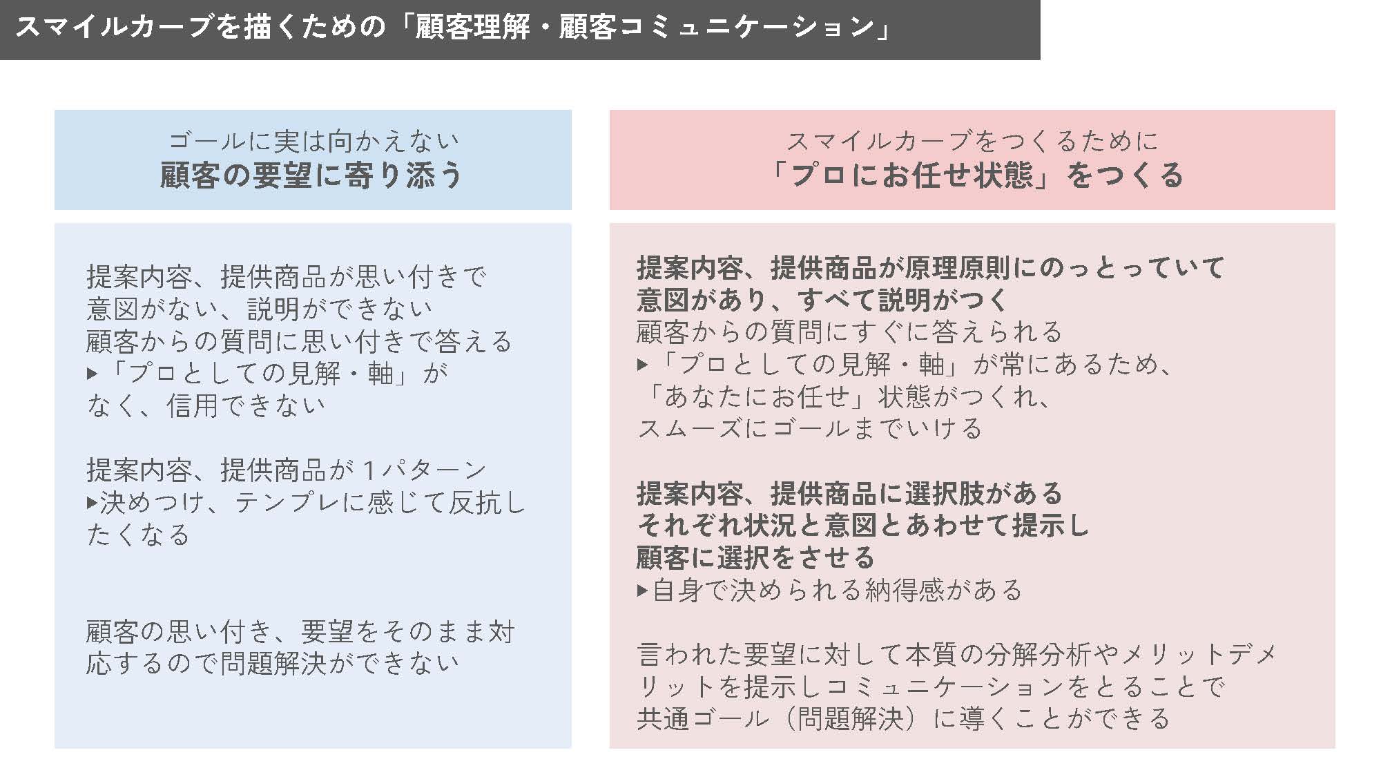 [間違い]に割り振られた行動に覚えのある人は、それがすべて無駄だったことと合わせて認識し、[目指すべき顧客理解]の考え方・行動に上書きしましょう。最初のハードルは、相手をリスペクトすることです。相手をリスペクトしたら、[間違い]の行動は自然にできなくなります。意味のないヒヤリングは相手の時間を奪い、相手の期待を裏切るだけです。リスペクトがベースにあることで、私達に積み上げられた過去の経験を活かし、共に語り考えることで「顧客の「解決すべき問題」」、「顧客自身が答え(現状や問題やなりたい姿)に気づく状態をつくる」、ここに一緒に到達することが「顧客理解」です。ここが制作チームのプロジェクトの起点になり、次のテーマのスマイルカーブの起点になります。営業もサポートも起点は本質的には同じです。