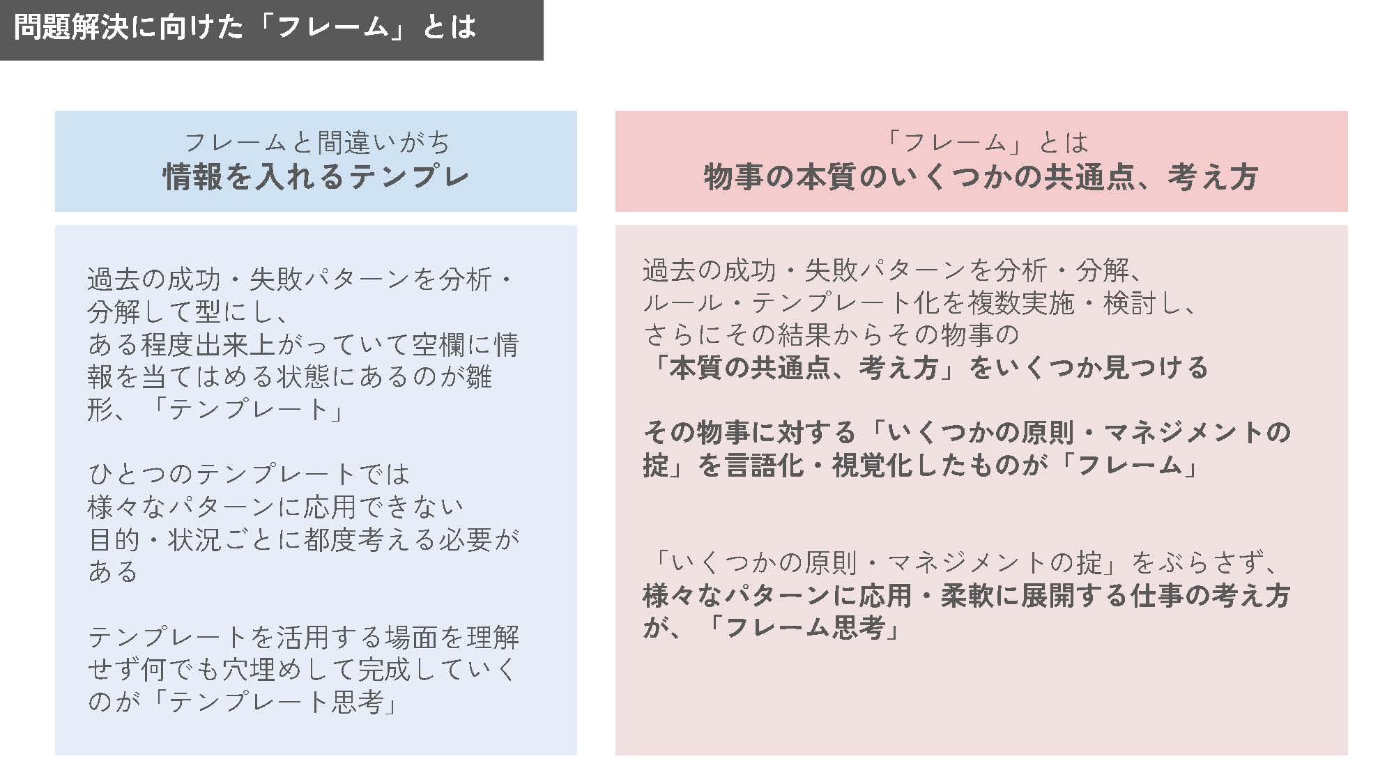 フレームの取り違い、[間違い]は穴埋め問題のテンプレに陥ることです。テンプレはパーツパーツでは有効ですが、フレームをテンプレにダウングレードして使うことに自覚がないと危険極まりないというか、顧客の時間と期待を奪い、顧客を失うことになります。Webサイト制作においても営業、サポートでも、テンプレではマイクロマネジメントで一挙一投足を指導されない限り仕事になりません。100プロジェクトで100個のテンプレが必要になるからです。フレーム思考は「いくつかの原則・マネジメントの掟」に従い、「解決すべき問題」の解法を多くても4つか5つくらいの中から取り出し運用する技術です。実践における正しい反復練習と過去実績の学習と素直にFBを受け入れ考え方を上書きすることによって身につきます。