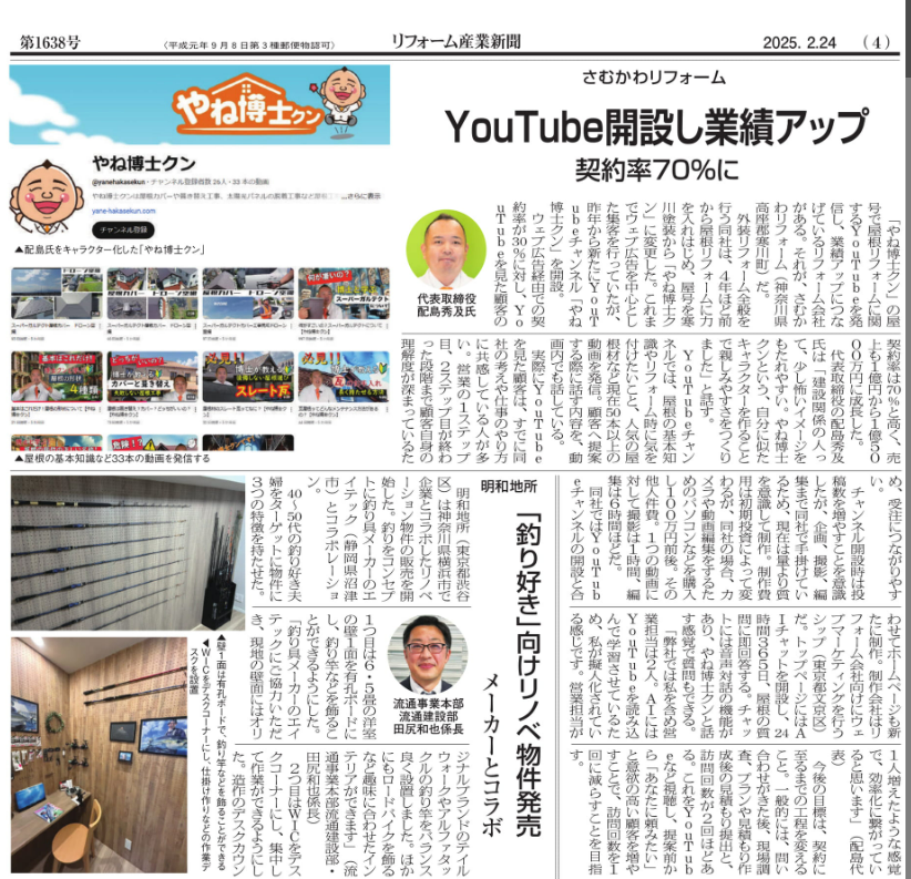 外装リフォーム全般を行う同社は、4年ほど前から屋根リフォームに力を入れはじめ、屋号を寒川塗装から「やね博士クン」に変更した。 これまでウェブ広告を中心とした集客を行っていたが、昨年から新たにYouTubeチャンネル「やね博士クン」を開設。