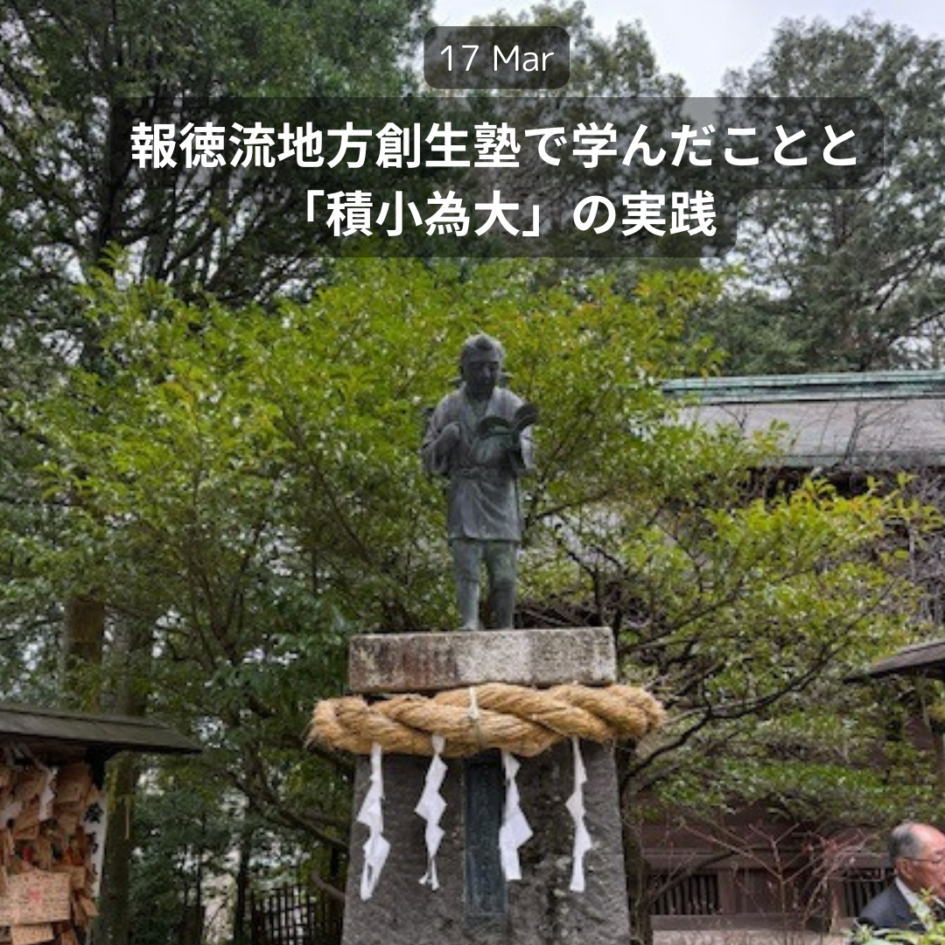 3月15日・16日、小田原の二宮報徳神社で「報徳流地方創生塾」に参加し、多くの学びを得ました。その中でも特に印象的だったのは、二宮尊徳の考え方が単なる勤勉や努力の話にとどまらず、地域の再生や社会全体の繁栄へとつながる「実践の哲学」であるという点です。尊徳は、精神論を説くだけではなく、現実の困難な状況の中で、具体的にどう行動すれば未来を切り開けるのかを示しました。