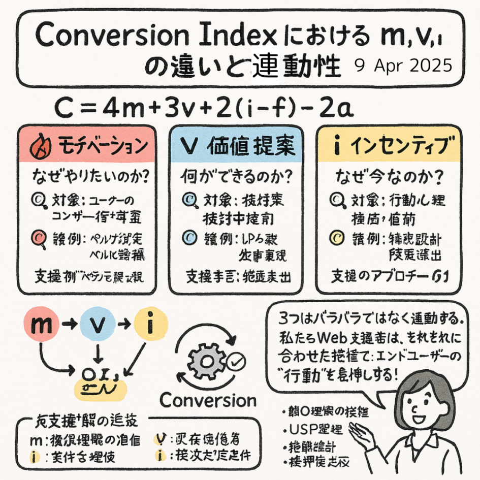 - v, iとの違い: v(解決策)や i(きっかけ)とは異なり、エンドユーザー自身の「内側」にあるものです。私たち支援者の役割は、このモチベーションを深く理解し、それに寄り添い、顧客(リフォーム会社)がそれを活用できるようサポートすることです。Conversion Index における係数が「4」と最も高く、コンバージョンへの影響力が最大です。