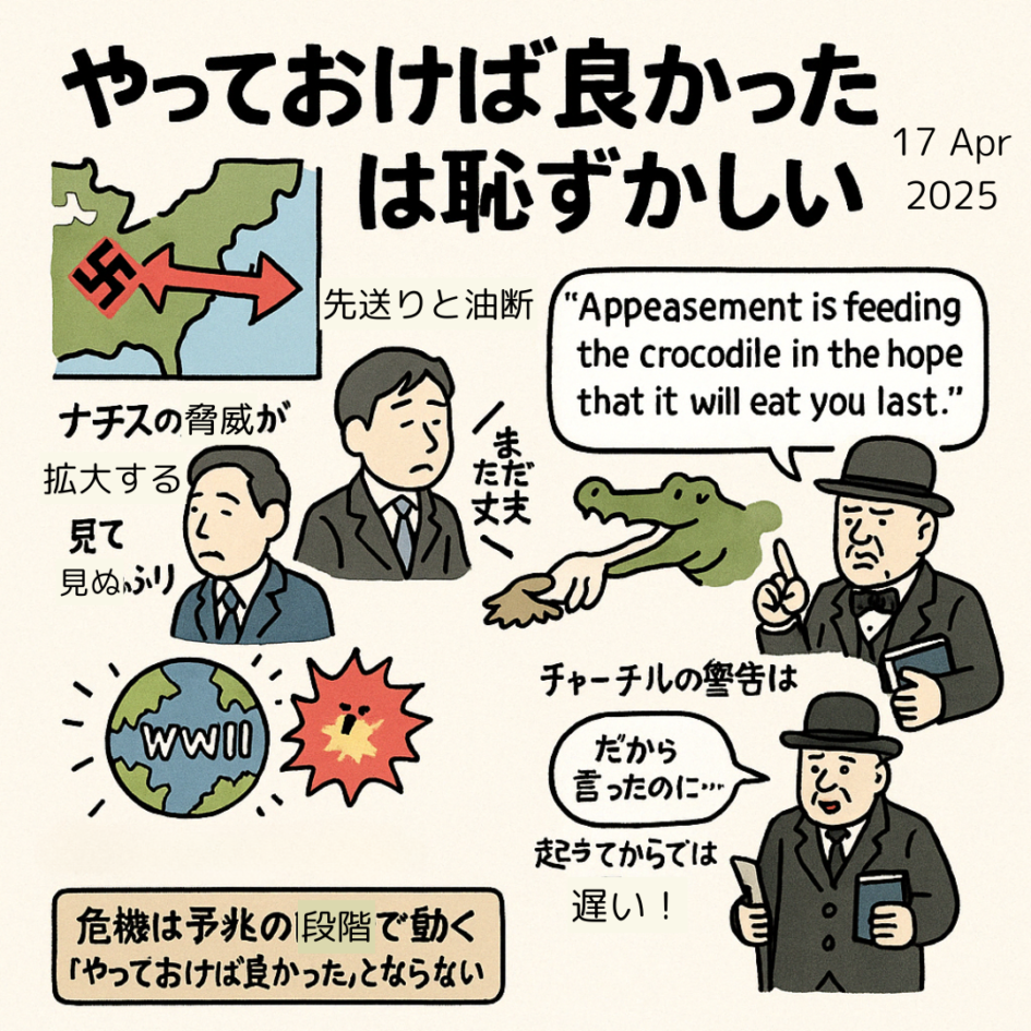 チャーチルは、差し迫る危機を前にして、今こそ動くべきだと訴え続けました。結果的にその警告は的中し、世界は戦争の渦に巻き込まれました。「起きてからでは遅い」──まさにそれを象徴する歴史的な出来事です。