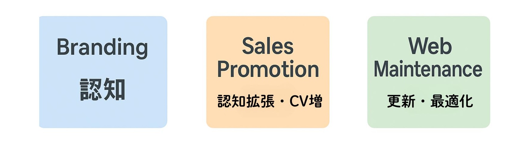 | セールスプロモーション支援 | 短期的な反響(CV)を獲得する | 広告運用・LP 改善・キャンペーン | 広告運用/営業連携チーム |