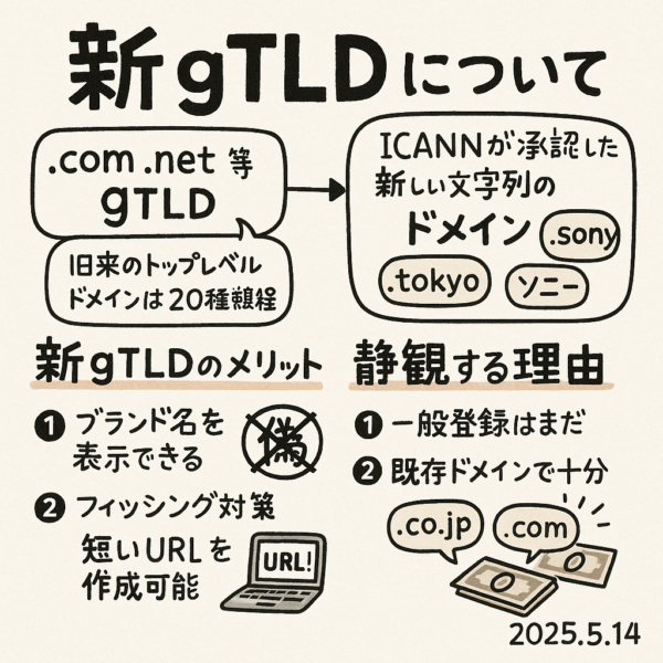 おはようございます。5月14日SHIPの朝礼を始めます。 gTLD とは Generic Top Level Domain の略で、国や地域に縛られない世界共通のドメイン・カテゴリーを指します。代表例… 続きはこちらから →