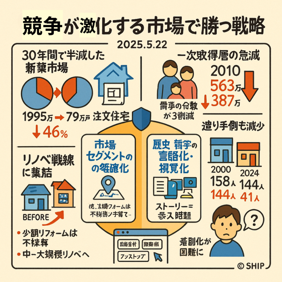 地域工務店は ▲35〜40 % 減。残存工務店は技術力を武器にリノベ市場へ雪崩れ込み、競争が激化しています。