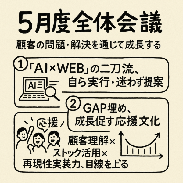 おはようございます。5月30日SHIPの朝礼を始めます。 顧客の問題・解決を通じて成長する 「AI×WEB」の二刀流、自ら実行・迷わず提案 GAP埋め、成長促す応援文化 顧客理解×ストック活用×再現性… 続きはこちらから →