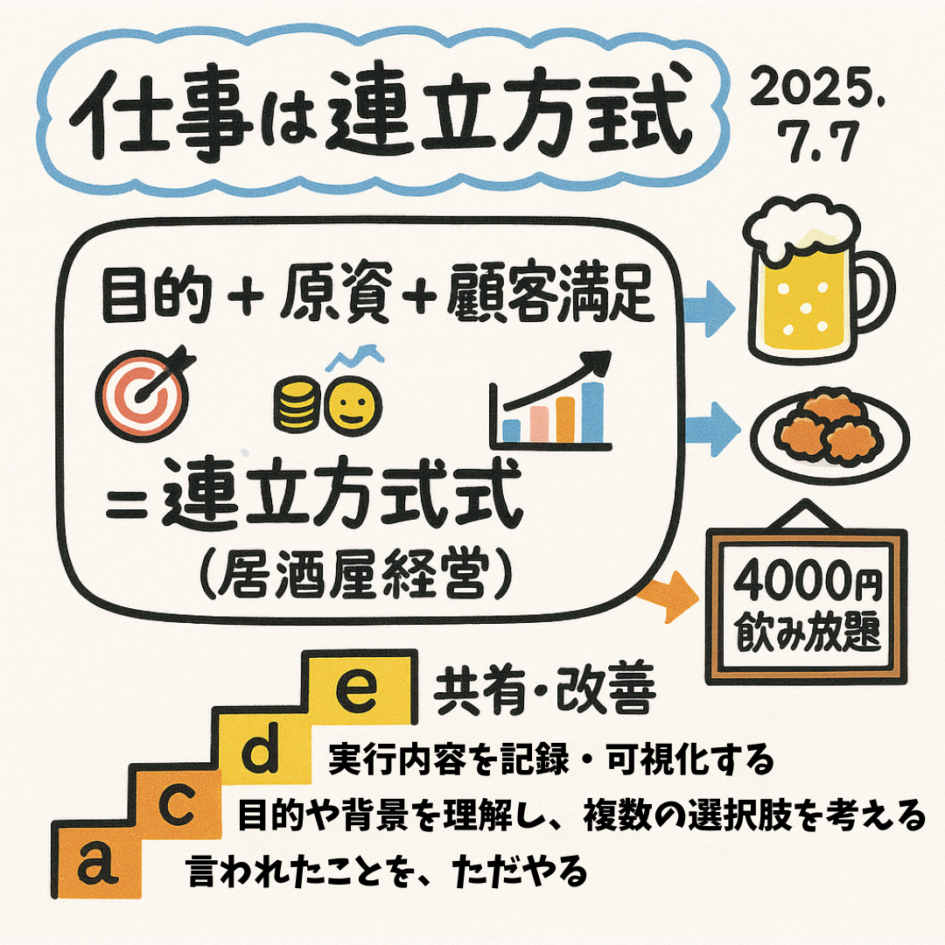 言われたことを“ただこなす”のもひとつの選択です。その背景にある方程式を解く姿勢を持とうとするのも選択です。仕事をもっと創造的で、手応えのあるものにするかしないか、すべて選択ですが、会社の理念は連立方程式がぎゅっと何重にも詰まったものだということはわかっておいた方がいいです。飲み放題一人当たり4,000円の居酒屋の店長の仕事を想像してみると良いかと思います。