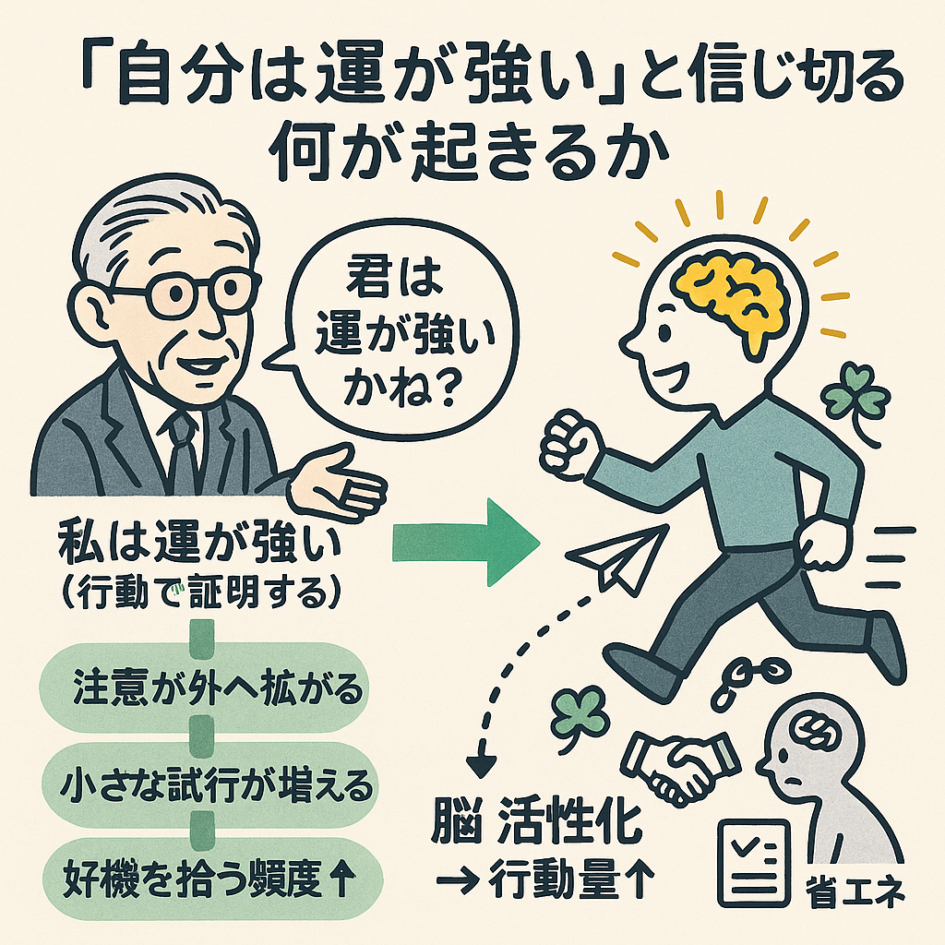 「自分は運がいい」という自己ラベルは、事実の粉飾ではなく 試行行動の閾値を下げ、探索バイアスを誘導し、好ましい偶然の統計をシフトさせる“心理的前処理” です。
