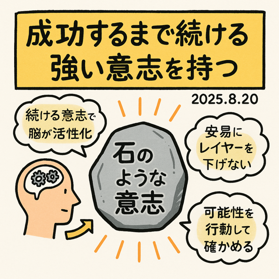 ビジネスの現場でも同じです。知識やスキル以上に成否を分けるのは、「成功するまで続ける」という揺るがぬ意志。壁にぶつかると「もう無理だ」と思考を止めがちですが、「必ず突破する」と心に刻めば、脳は止まらずに働き続けます。解決策を探し、動き続けるエネルギーが生まれるのです。