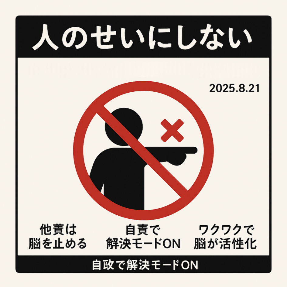 人のせいにすれば一時的には楽に感じられます。しかし、それは思考の停止であり、成長の放棄です。問題を「自分の問題」と捉え直すことで、脳は自動的に「どう解決するか?」と考え始めます。つまり、責任を引き受けることが、解決モードにスイッチを入れる唯一の方法なのです。