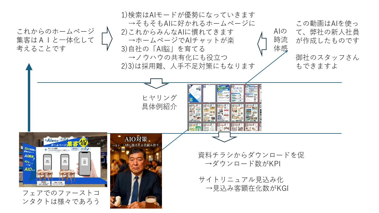 リフォーム産業フェアでの活動は、どのような入口から会話が始まっても、「これからのホームページ戦略はAIと一体で考える必要がある」という気づきを共有することが出発点です。そこから実績をもとに具体的な行動へ導き、成果へとつなげていきます。