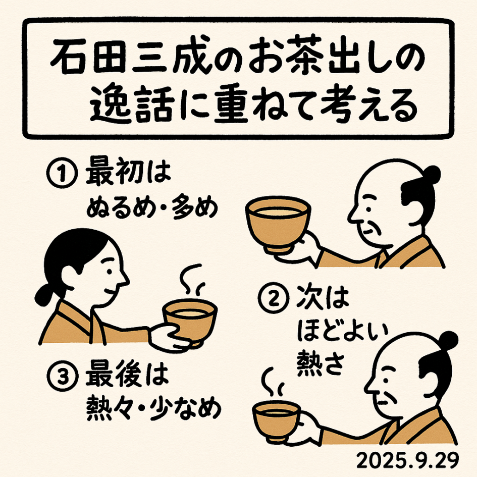 三成は最初にぬるめで量の多い茶碗を差し出し、次にやや熱めで適量の茶を、最後に熱々で少量の茶を供しました。秀吉はその心配りに感心し、彼を召し抱えるきっかけとしたと伝えられています。