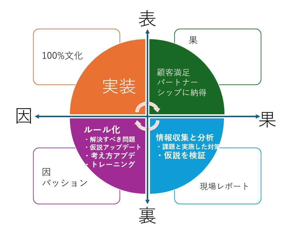 PDCAという言葉はきいたことがあると思いますが、それと同じようなことですが、PDCAのCつまりCheckが右下になります。会議などで仕事を振り返り今後の行動を発案するプロセスです。何を振り返るか、上になる実際顧客にもみえている実行と結果です。結果が目論見や仮説と比べてどうなのか? うまくいっていればルール化する要素のひとつになるし、実装と結果がうまくいってなければ、左下の仮説を修正アップデートして再度実装して結果を出して、チェックしていくことになります。