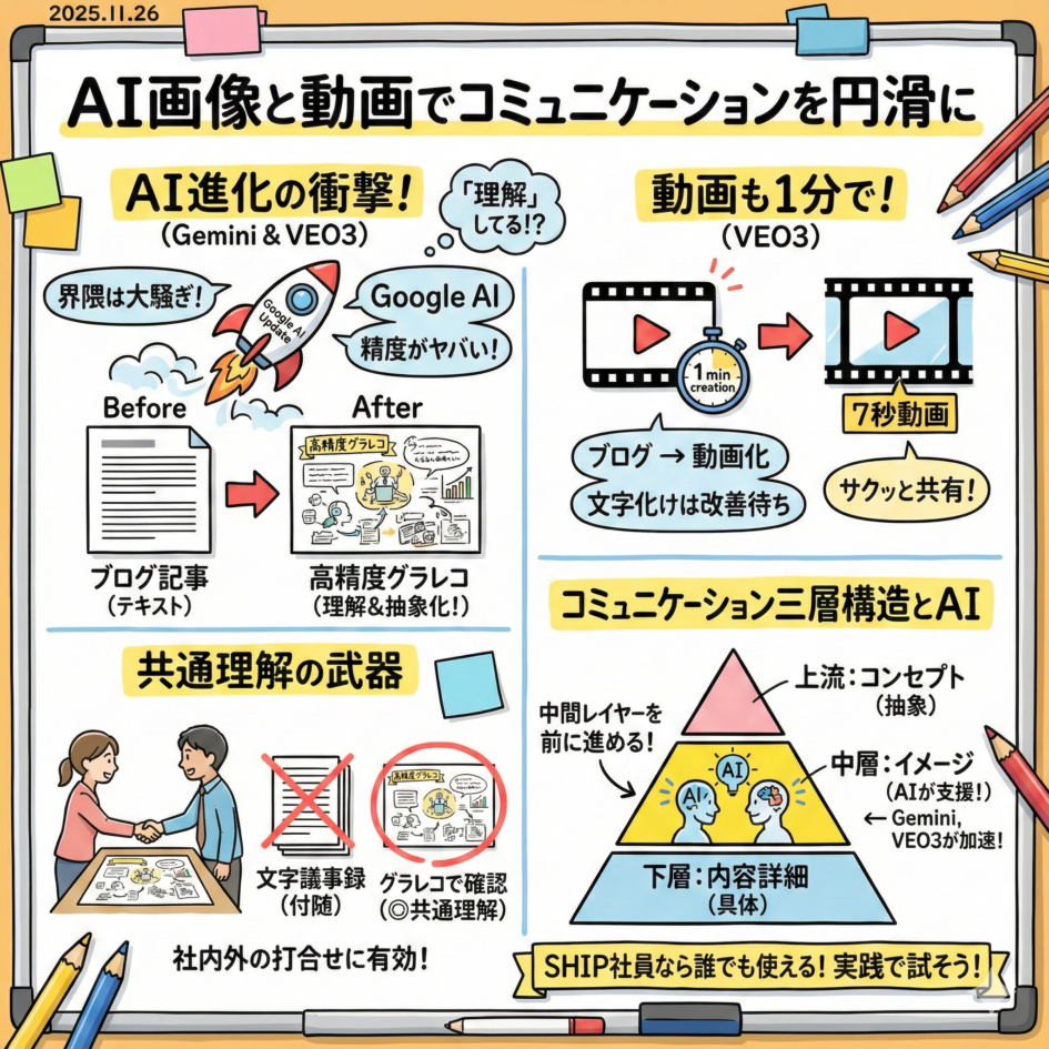 他人とのコミュニケーションも「三層構造」を意識すると有効です。上流レイヤーはコンセプト、中間レイヤーはイメージ、下層レイヤーは内容詳細、そう考えると今日紹介したツール、SHIP社員であれば誰でも使えるGEMINI3を中心とした環境では、コミュニケーションの中間レイヤーを前に進めてくれます。実践で試してみてください。