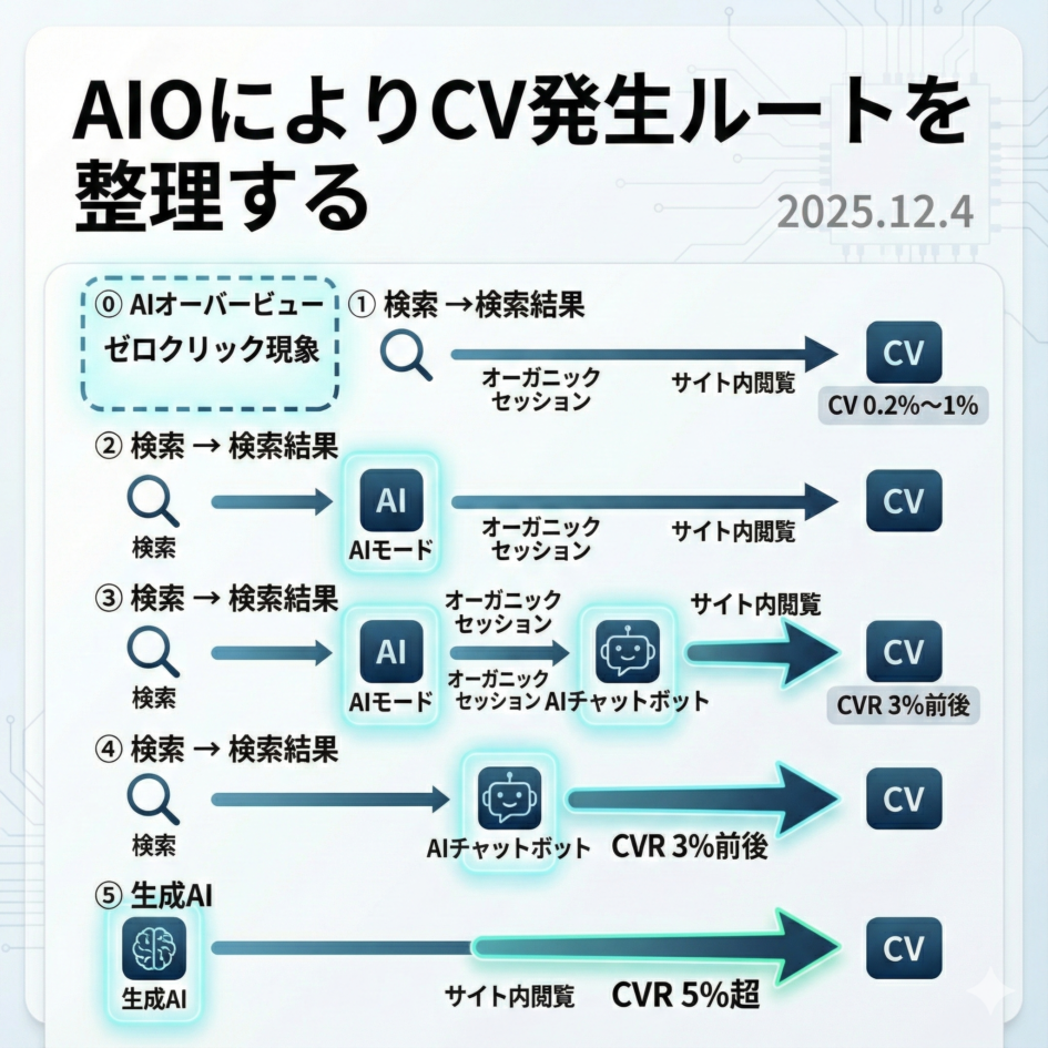AIオーバービューの普及によって検索行動が大きく変化し、ゼロクリックが増えてWebサイトに来る人が全体の三割ほどに減少している一方、AIオーバービューやAIチャットボットを経由した訪問はCVRが高い傾向が確認されている。AIの説明の中にユーザー企業が登場し、そこからサイトに訪問してチャットボットで疑問が解消される流れ自体が顧客便益性と独自性を高め、CV増加に直結する。