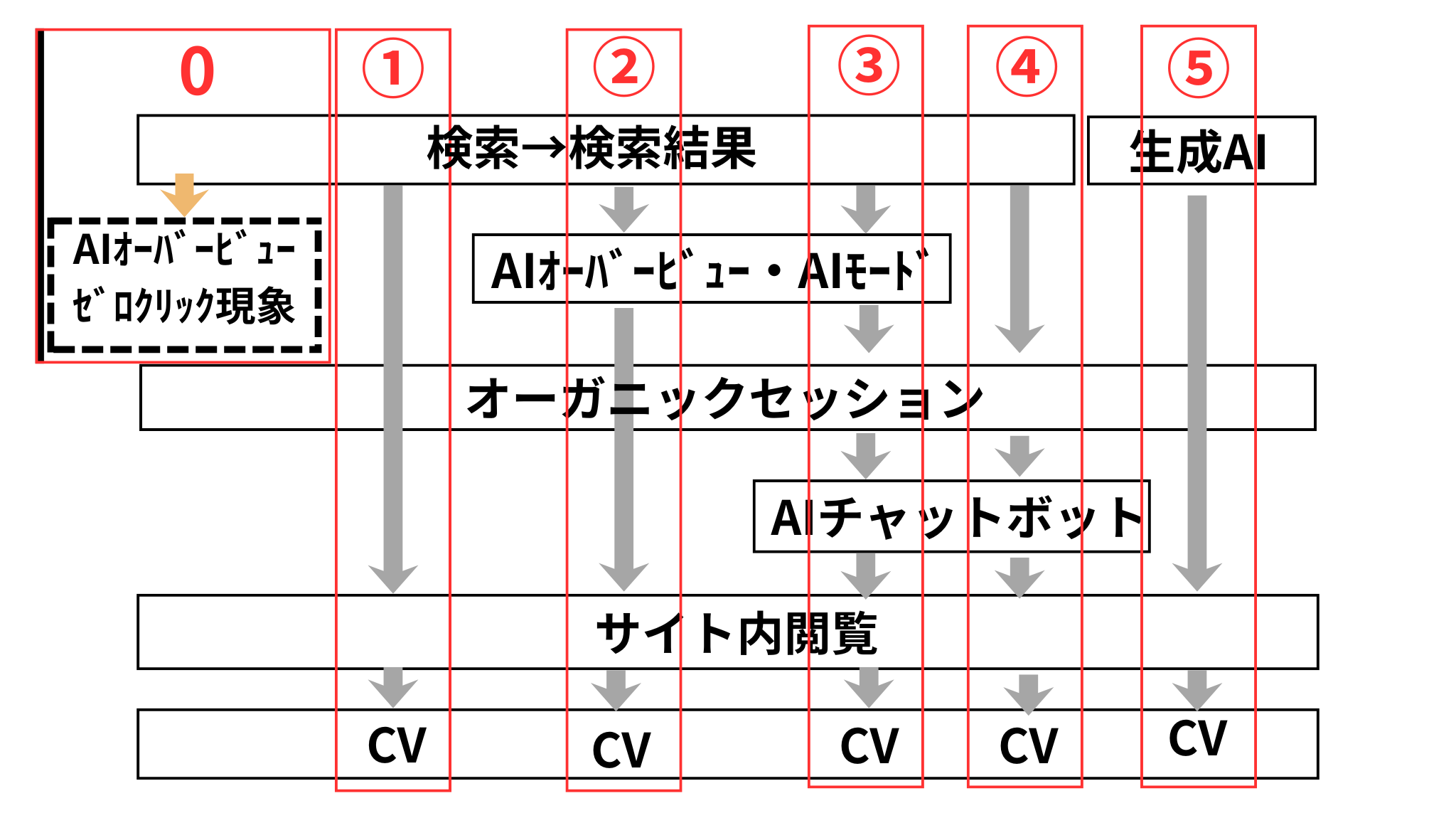 ②の 検索→AIオーバービュー→Webサイト は、AIオーバービュー内に表示またはリコメンドされたか否かで差はあります。またAIオーバービュー→Webサイトの情報が取れないので、なんともいえませんが、通常のオーガニック検索よりはCVrは高くなると考えられます。