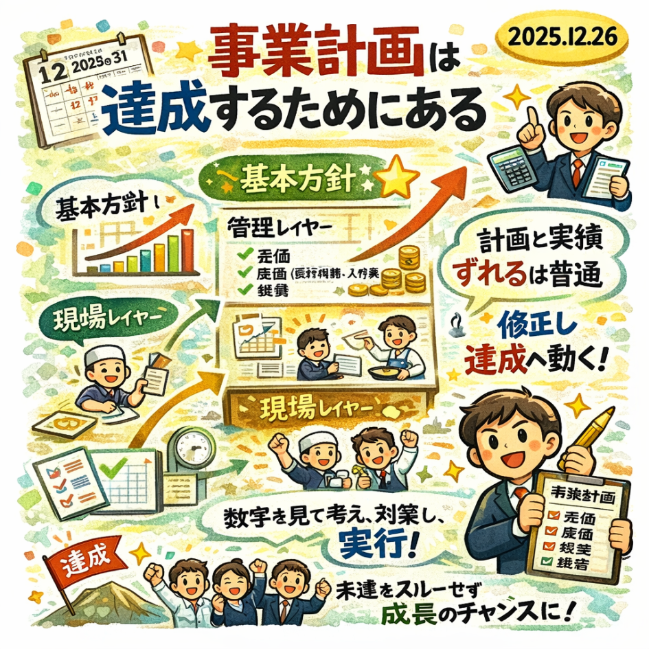 ここから私たちが学ぶべきは、「事業計画は飾りではない」という一点です。計画は、達成するためにある。計画と実績がずれるのは普通のことです。そのうえで、ずれたら修正に動く。何が問題かを探し、考え、対策を議論し、実行に移す。数字は冷たいようでいて、実は現場を守る温度計です。未達をスルーせず、構造(売価・原価・人件費・経費・集客)を点検し、打ち手を更新する。その繰り返しが、管理レイヤーを担う人の仕事であり、チームを率いる人の責任です。