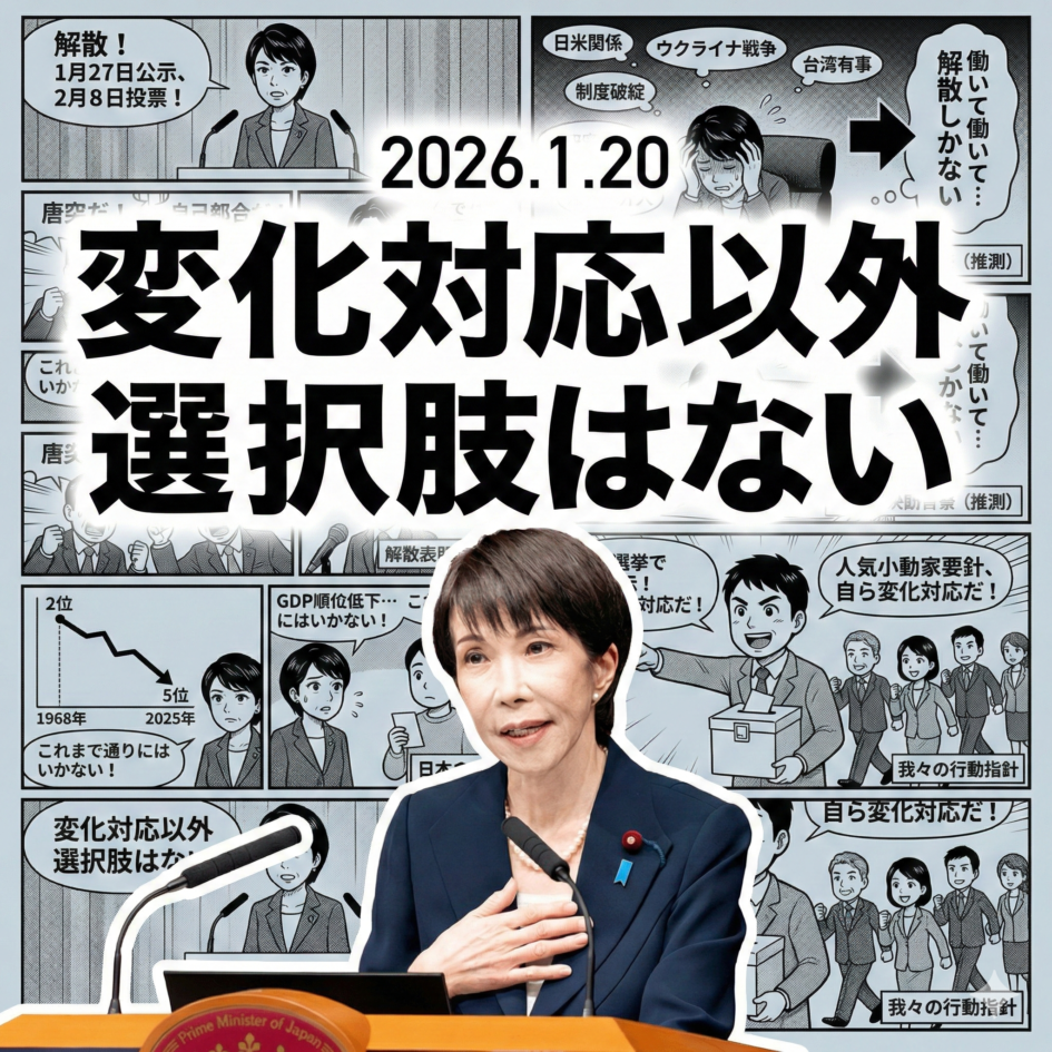 高市総理大臣の決断に、野党は解散は唐突だ、自己都合だと批判の大合唱ですが、野党ですから批判は仕事です。マスコミも同じです。見識ある批判は不勉強もありますが、目にしたことはありません。マスコミにとって批判は仕事だし、批判した方が売れるのだろうと思います。メンバーの皆さん向けの朝礼ブログでの私は批判は仕事でないので、推測的解読と「で、我々はこれからどうすればいい」を書きたいと思います。