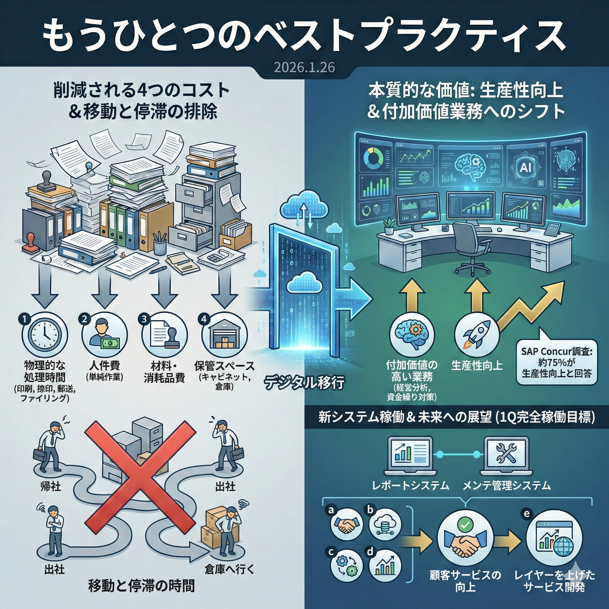 タイトルの「もうひとつのベストプラクティス」ですが、前期行われた管理部による業務のデジタル化の推進のことです。「紙・ハンコ・対面」に依存するアナログ業務を昨年をデジタルへほぼ完全移行することができました。これは単なるペーパーレス化にとどまらず、業務工数の70%〜90%削減という劇的な生産性向上をもたらすことが、複数の実態調査により明らかになっています。