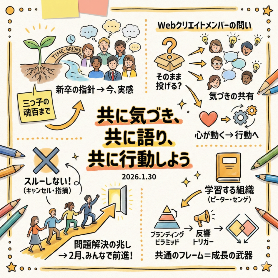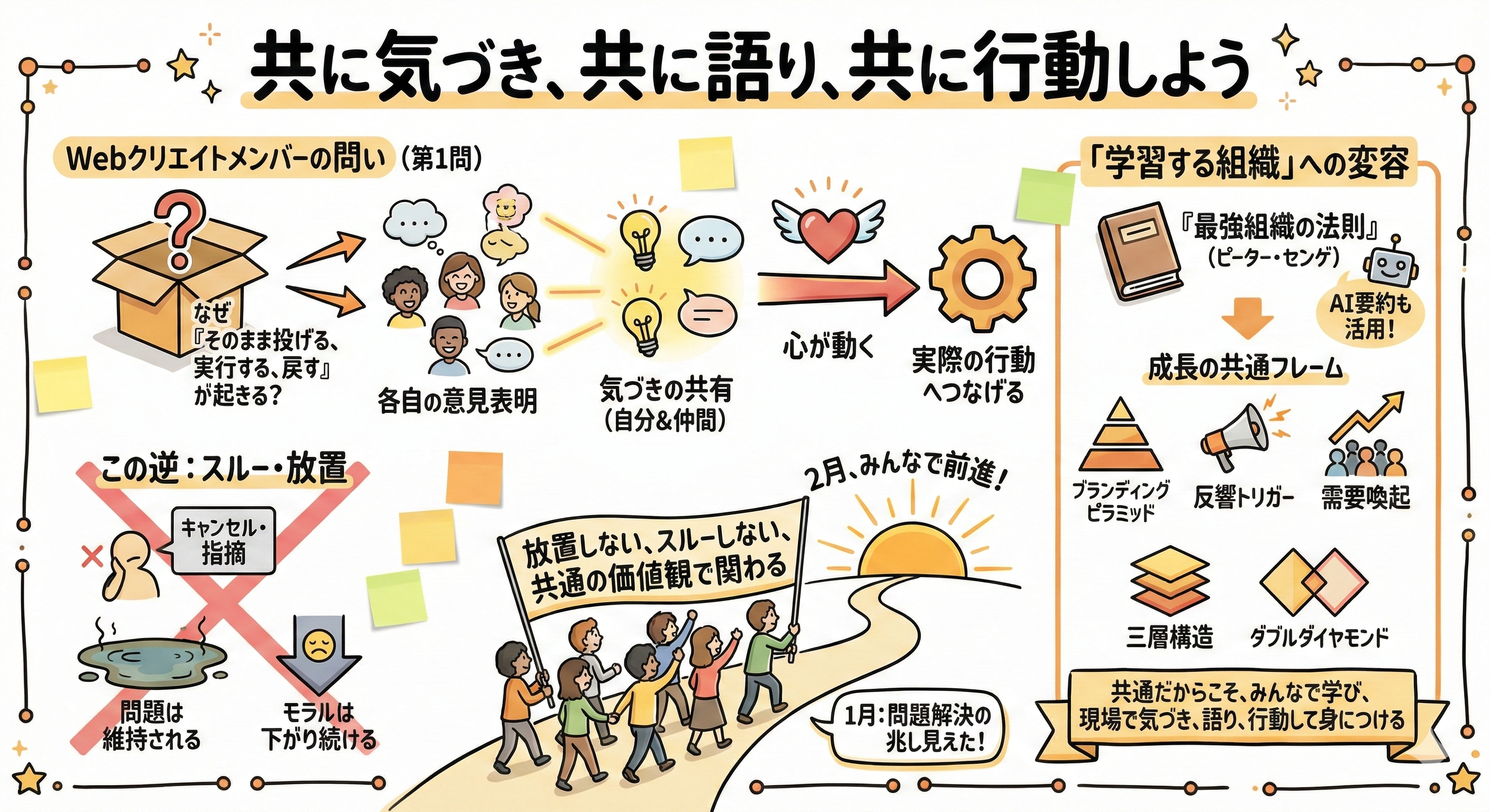 フレームは共通だからこそ、みんなで学んで、みんなで現場で気づいて、みんなで現場で語って、みんなで現場で行動することで身についていきます。