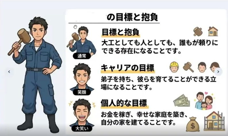 しかし、夕方には全員の発表がありました。特に22才の大工さんの発表内容が印象的でしたので紹介します。