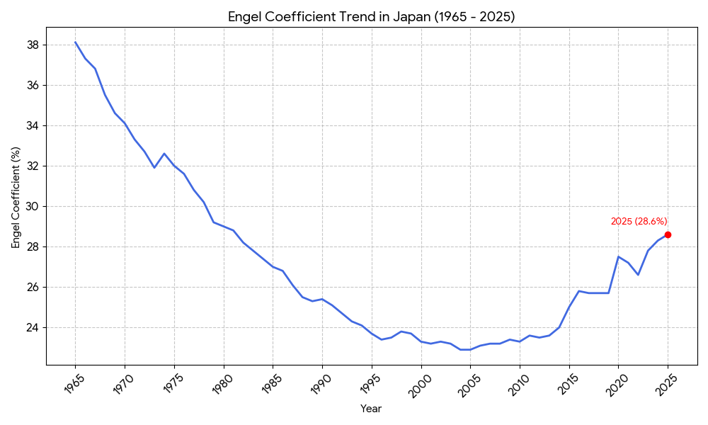 日本の歴史的な推移を振り返ると、1965年から1995年頃にかけて、経済成長とそれに続く生活水準の向上によりエンゲル係数は順調に低下し続けてきました。しかし、10年前くらいから明確な上昇トレンドへと転換。現在、長引く物価高騰などの影響も相まって、過去数十年で最も家計のゆとりが失われつつある状況にあります。