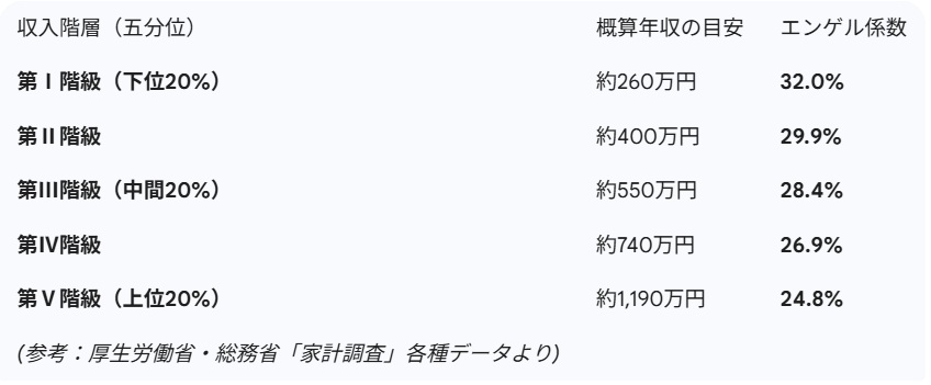 この実態を把握するため、代替データとして2023年の「年間収入五分位階級別(所得別の分布)」を用いて各層のエンゲル係数を割り出したところ、年収550万円以下の世帯群ですでに全体平均を上回っていることがわかりました。一部の富裕層に引っ張られる平均値に対し、大多数の一般的な家計を示す「中央値」の現実はよりシビアです。2025年の平均値が28.6%まで上昇していることを踏まえれば、国民の半数以上にとっての体感値である中央値は、間違いなく「30%」を軽く超えていると考えられます。