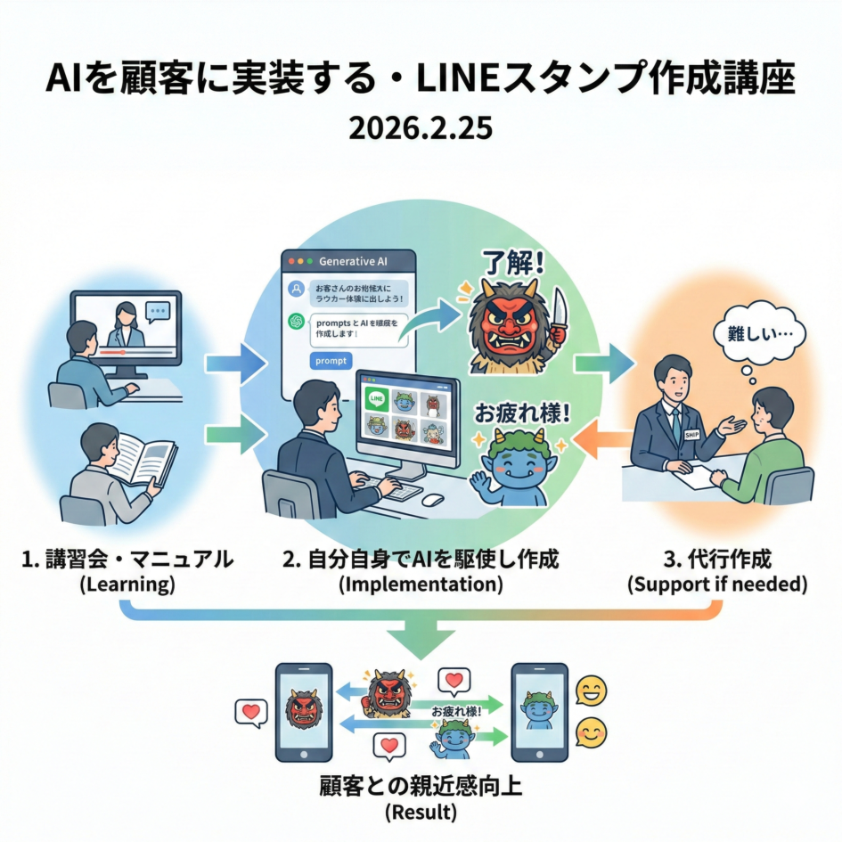今や生成AIを使えば、誰もが簡単にオリジナルのLINEスタンプを作成できる時代になりました。自社を思い出させてくれるような親しみやすいキャラクターをLINEスタンプにして、日常的にお客様とやり取りをする。それだけで、「単純接触効果(ザイオンス効果)」が働き、お客様からの親しみが自然と増していくという非常に有効なアプローチです。