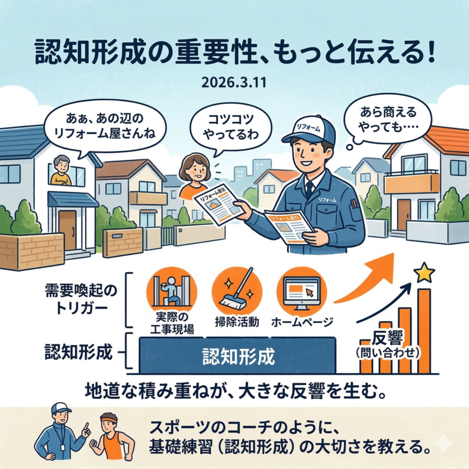 その頃にはホームページもシップ社に依頼して立ち上げているでしょう。認知が形成された上で需要喚起の行動をとることで、気になった方はホームページをご覧になり、「大丈夫そうだ」と感じたら、掃除をしている私に、まるで今気づいたかのように声をかけてくださるかもしれません。「◯◯さんのお宅をリフォームしているリフォーム屋さん?」と。