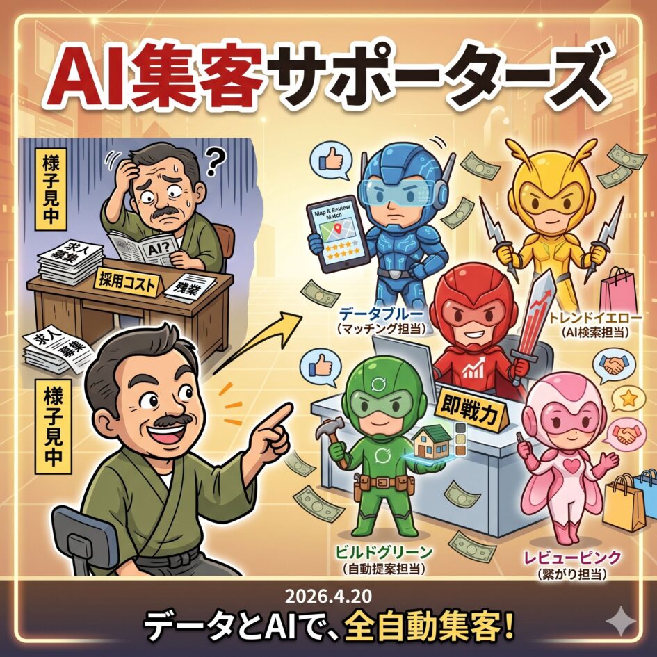 だとしたら、私たちの集客戦略もまた、「AIに全振り」するしかありません。AIが情報を整理し、AIが推薦を決定する世界で、AIを無視した集客はもはや不可能です。私たちがすべきは、AIを恐れたり、遠くから様子を伺ったりすることではなく、AIを「乗りこなす」こと。その決意のもと、新サービス「AI集客サポーターズ」を組成いたします。