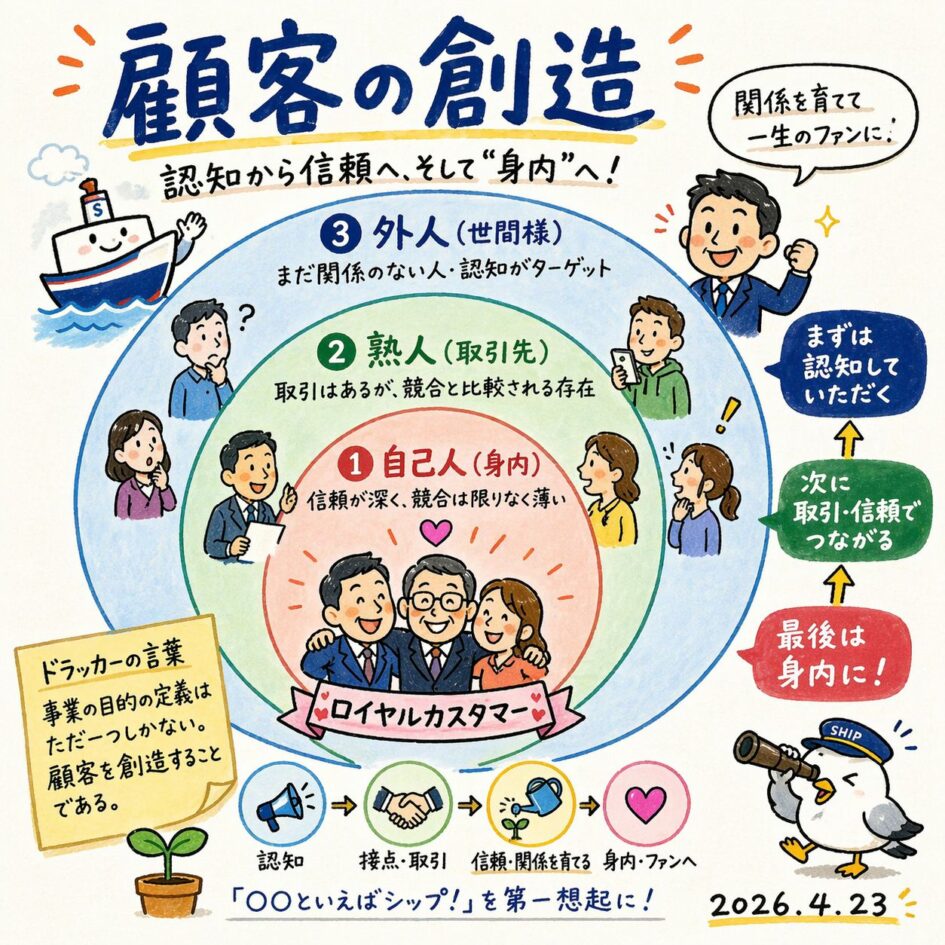 この言葉は、単に新規客を増やすという意味ではありません。認知を生み、接点をつくり、関係を育て、やがて競合の薄い存在になるまで信頼を深める。その一連の営み全体こそが、「顧客の創造」なのだと思います。