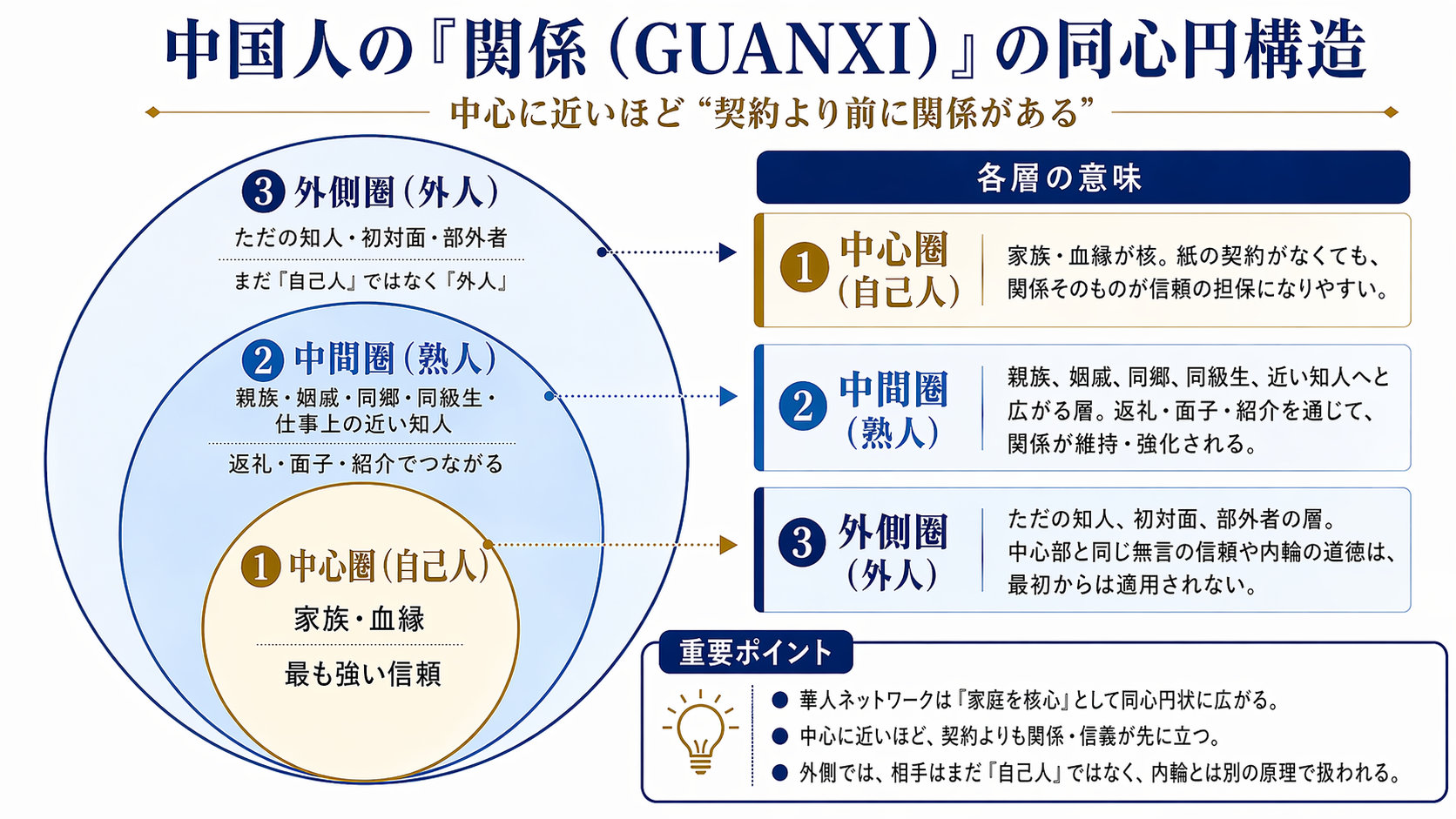 そこで学んだのは、中国人が人間関係を三重構造で捉えるという考え方でした。中心には「自己人」がいます。家族や濃い血縁、あるいは義兄弟のように強い信頼を交わした相手です。この関係の内側では、契約書がなくても約束を守ることが当然で、相手に尽くすことさえ自然な振る舞いになります。